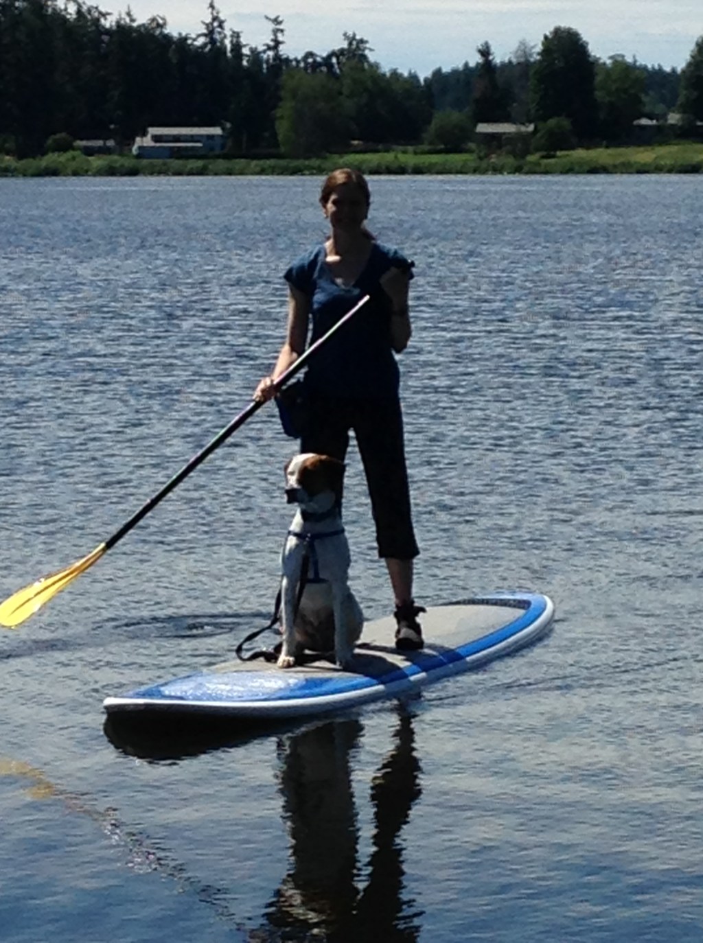 When we get to the water we start on quiet lake, as it can be tricky to maintain your balance in waves, which makes it scarier for your dog. Outfitting your dog in a life vest will help your peace of mind if he accidentally falls off, as well as give you a handle to lift him back on the board.